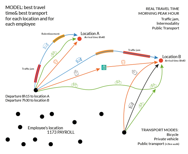 The TracToZero Employees Mobility Analysis webapplication assesses the origin and destination of all company movements for the home-work transportation modes. It also identifies where sites should be located to optimize company mobility for both commuting and service trips and suggests ways to make mobility more sustainable.
